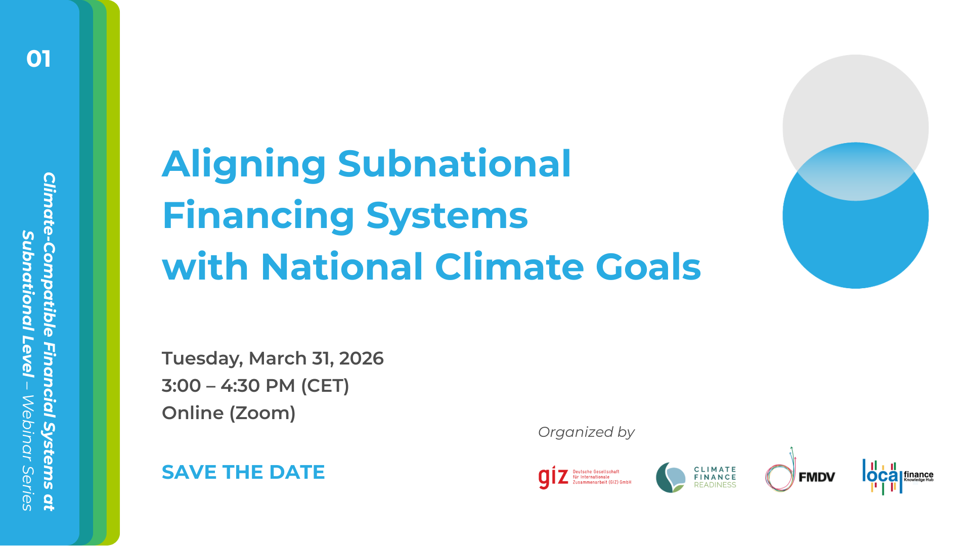 The webinar series is organized by FMDV – Global Fund for Cities Development and Deutsche Gesellschaft für Internationale Zusammenarbeit (GIZ) GmbH under the Partnering for Readiness (PfR) project, which supports partner countries in accessing and implementing international climate finance through knowledge sharing, peer exchange, and targeted capacity-building.